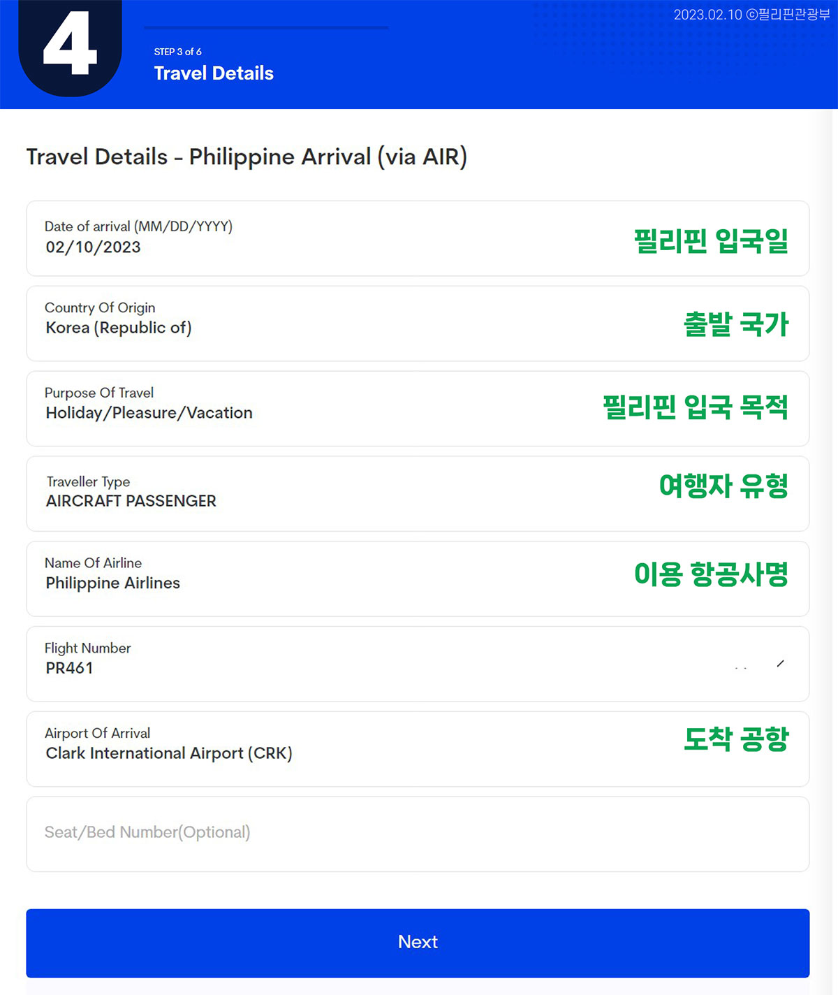 필리핀 입국일, 출발국가, 입국목적, 여행자유형 (비행기), 이용항공사명, 항공편명, 도착공항을 체크하시고 확인하시면 됩니다.